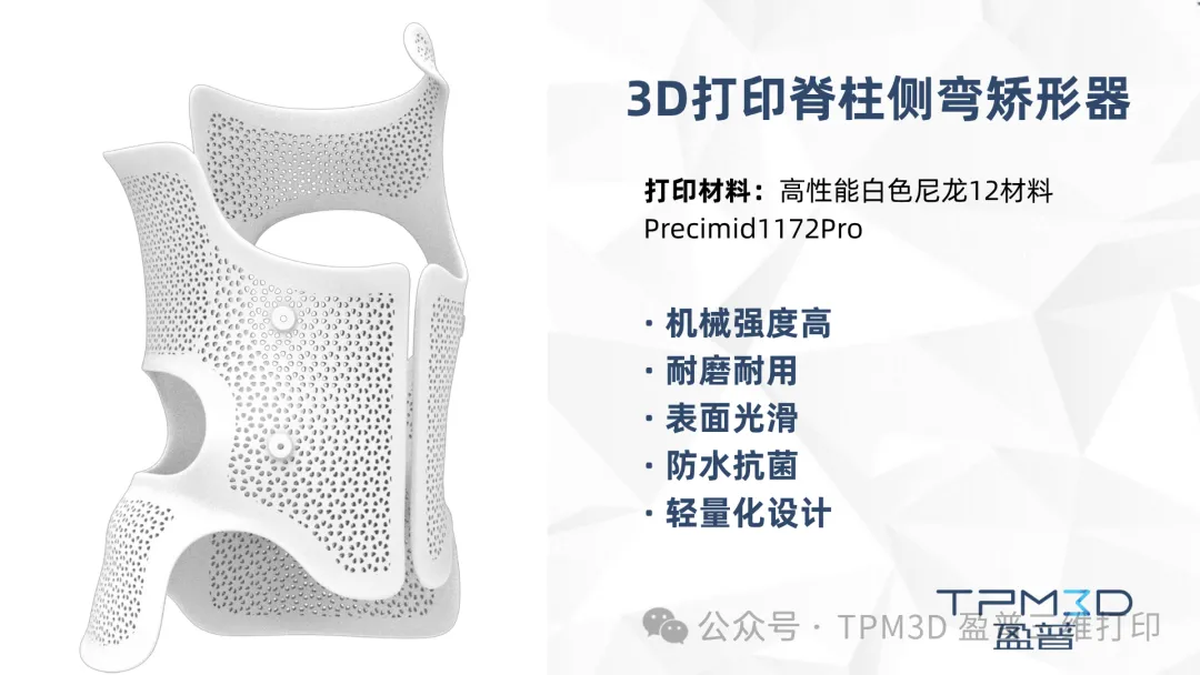 在材料選擇上,盈普采用高性能白色尼龍12材料Precimid1172Pro。這種材料具備出色的機械強度,能夠為脊柱提供可靠的支撐力,有效進行側彎矯正;材料耐磨耐用的特性,確保支具在長期使用過程中不易損壞。經過化學蒸汽平滑處理后,支具表面光滑細膩,不僅防水抗菌,保障佩戴衛生,還極大提升了佩戴的舒適性。輕量化的設計,讓孩子告別傳統支具的沉重負擔,活動更加輕松自在。