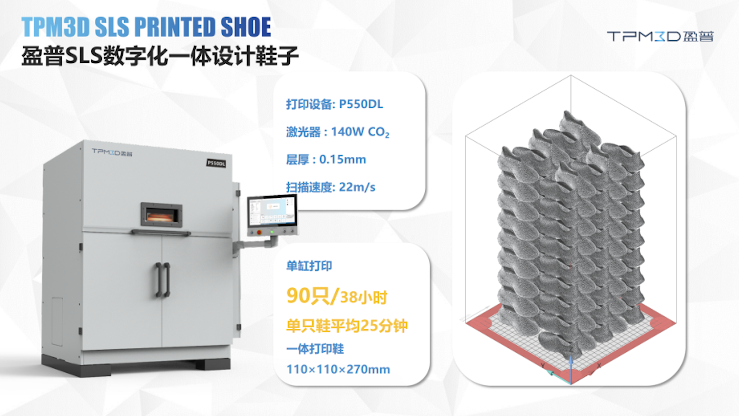 盈普大尺寸雙激光 SLS 增材制造設備 P550DL 以 0.15mm 層厚、最高 22m/s 掃描速度燒結 Precimid 系列高分子粉末,單缸 38 小時可產出 90 只成品鞋,實現批量生產、從數據到成品無縫銜接。