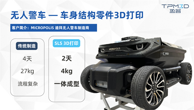 迪拜無人警車制造商 MICROPOLIS 采購盈普 S600DL 設備,使用 Precimid1172Pro GF30 BLK 玻纖增強材料,設計制造無人警車(包括車身結構零件等),其中代表性零件為大尺寸車頭零件,有效解決傳統工藝痛點。