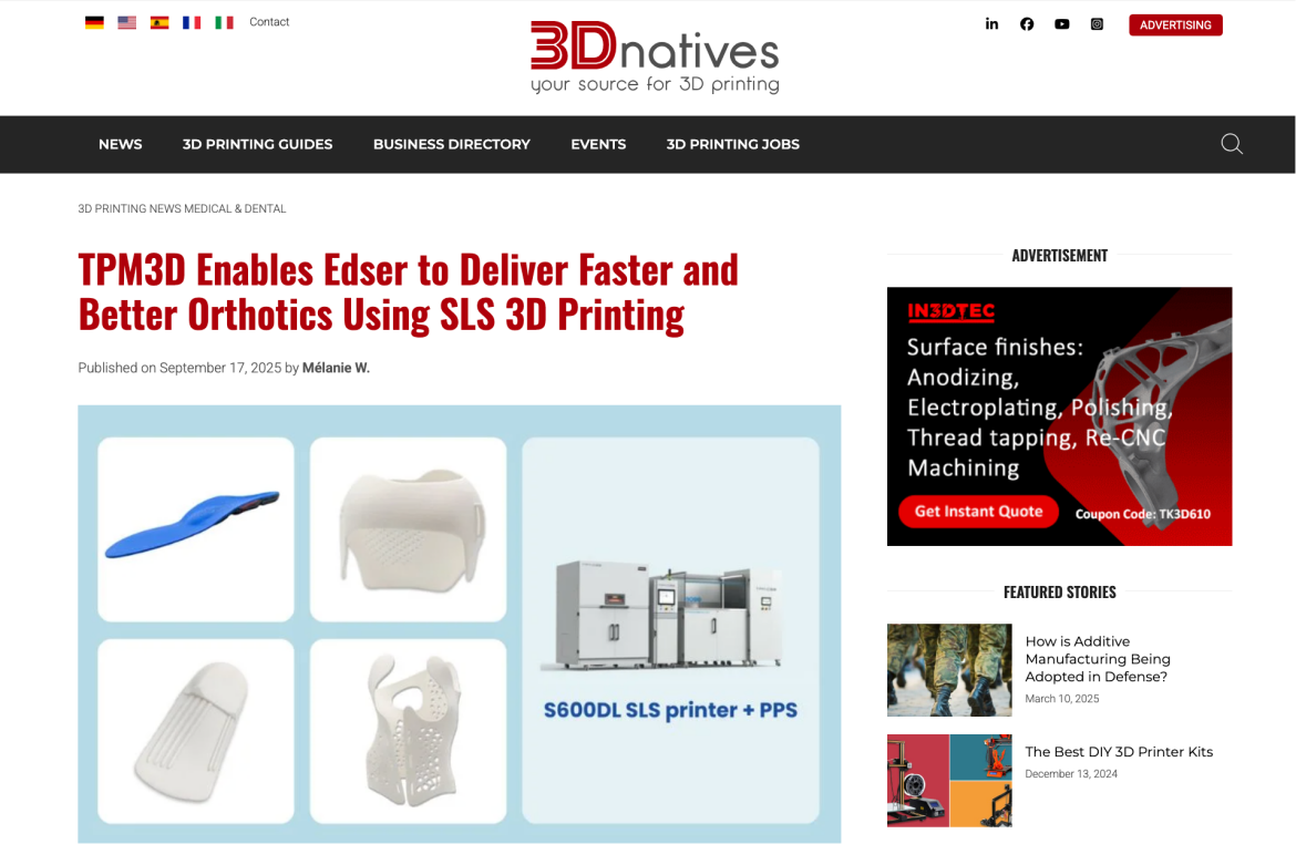 近日,盈普三維(TPM3D)與西班牙醫療企業 Edser 的合作案例獲得全球 3D 打印資訊權威平臺 3Dnatives 專題報道。